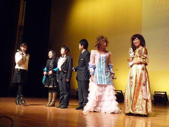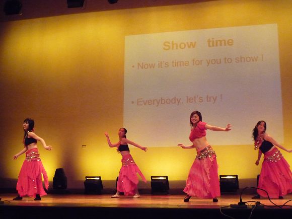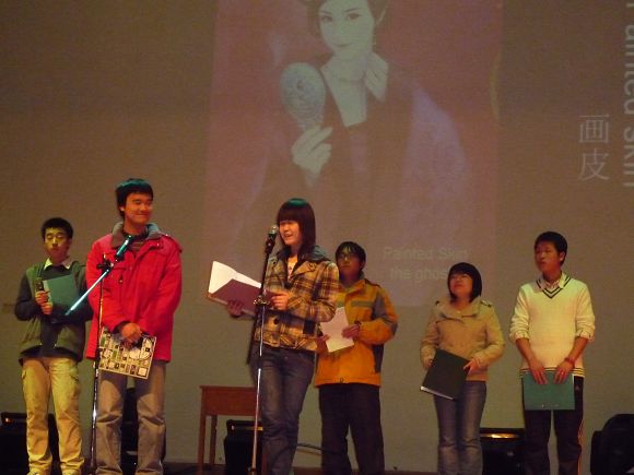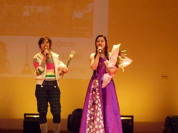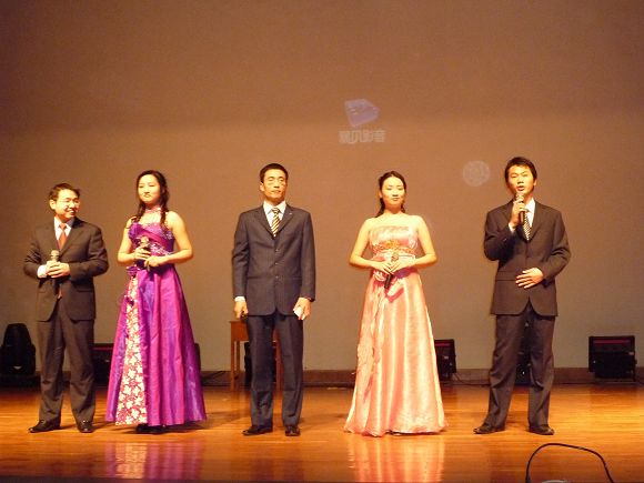 主持人由公外部的老师和英语调频台的成员共同担当,他们用流利的英语带领大家展开此次的英语学习与娱乐之旅。晚会在小合唱的精彩表演中拉开序幕,紧接着由公外部的王力维老师和员工郭英英共同合唱一首‘just one last dance’引来了晚会开场的一个高潮;此次的晚会亮点很多,有代表英语调频台的‘NBA解说’、和朗诵‘画皮’充分展现了他们流利的英语口语;有精彩的中场游戏,有公外部老师表演的国际标准舞,还有同学们带来的精彩、幽默的话剧:‘Necklace’、‘Happy Hotel’和'Mulan’s Military Life’ ;还有钢琴、吉他和小提琴的同台献艺;一曲曲悠扬的音乐,一段段让人开怀的段子,和一支支优美的舞蹈汇聚到今天的晚会现场。