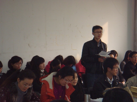 会议第二个环节由新老师刘亚光老师介绍了他创新的英语教学方法,包括分组教学、较难词汇的讲授、平行结构的讲解以及B篇课文的讲解等等。提出了英语教学要立足于教材-高于教材-回归教材的理念。