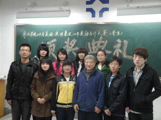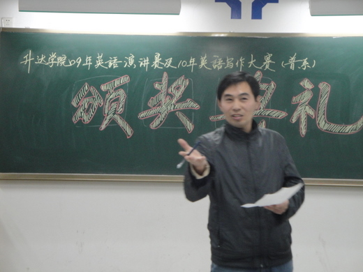 接下来颁发写作大赛奖品及证书。由张爱卿主任、贺光辉、赵祥云、夏现涛老师分别为选手颁发获奖证书和奖品。获奖代表09级资讯系电本一班杨孩讲话,他用流利的英语发表了自己的获奖感言,感言深受好评(感言原文附后)。随后评委小组组长张庆凯老师点评此次作文竞赛,他指出参赛选手在写作中存在的问题,并提醒同学写作时应注意字迹工整、书写规范、布局合理、符合逻辑等要求。最后张爱卿主任作总结讲话,他首先向到场师生表达了冬至节日快乐,向获奖同学表示衷心祝贺,随后他指出写作与演讲在英语学习中的重要性,并总结英语学习中输入与输出的关系,希望员工提高综合语言技能,并期待同学们在下一年演讲比赛及写作比赛中取得更优异的成绩。为号召广老员工向榜样学习,所有获奖文章将在近期在全校公示。