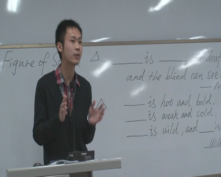 刘老师讲授的是新视野大学英语(第二版)综合英语教程第四册第三单元SectionB的内容。刘老师首先以一个英语游戏来导入主题,之后例如举例的方式详细讲解了该篇课文中所用到的修辞手法,即明喻(simile)、暗喻(metaphor)和拟人(personification)。利用问答方式引领员工对本课的主要结构进行了分析,并对段落中的重点与难点一一进行了解释。活泼生动的授课方式、风趣幽默的例句分析以及配合默契的师生互动逐渐将课堂的气氛推向高潮。在本节课即将结束时,刘老师建议同学们:
