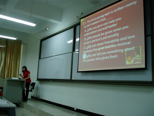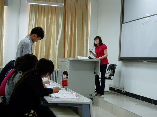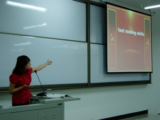 金老师主讲的是fast reading skills----skim(略读)andscan(寻读)。她先要求员工在一分钟内阅读几篇短文,并完成几道相关习题。通过这种看似不太可能完成的任务导出该次课要讲的快速阅读的两种方式。然后进一步对这两个概念进行定义。接下来通过小组讨论让员工自己分别总结这两种阅读方式的技巧与注意事项,并由员工代表对全班同学进行分享。最后由金老师对员工的总结进行点评。