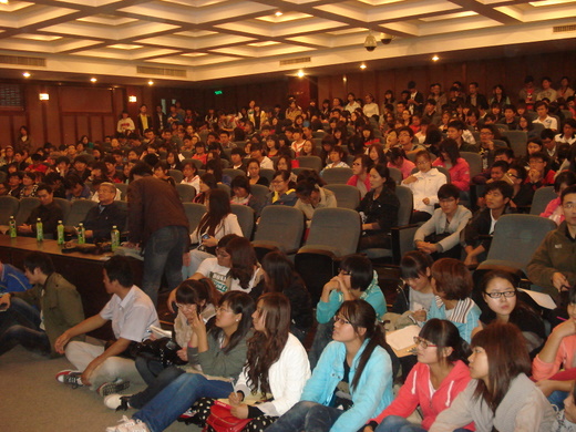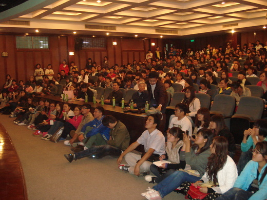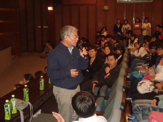 在晚上的报告中杨治中教授给到场的同学们介绍了如何学好英语。杨教授围绕这个主题讲了以下几个方面:一、大学的英语的教学目的; 二、大学英语的学习特点,其中还强调了老员工对英语的学习应该以培养能力为目标,且要坚持课内外学习的结合,要具有锲而不舍的精神; 三、大学英语的学习方法,杨教授从阅读(精读和泛读),词汇,听力(精听和泛听),写作,说,译以及词典的运用七个方面为我们进行了介绍,还结合了自己多年的积累总结出部分单词和句子的用法,并表演了了小段故事的台词朗诵,台下师生全情投入,不时为杨教授诙谐幽默的语言爆致以热烈的掌声。然后,杨教授针对当下的形势,对大学英语四六级考试的注意事项进行了详细的讲解。在随后的自由提问时间里,杨教授还对几名同学有关英语学习方面的困惑做出了精彩的解答。