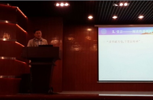 会上,夏现涛老师作了题为“公司非英语专业员工英语阅读水平现状与对策分析”的主旨报告。他在发言中首先基于数据论述了阅读在员工综合英语水平以及四级考试里的重要意义,随后指出公司非英语专业员工在阅读中出现的问题。紧接着,夏老师提出了阅读教学团队老师们提出的建议,即:培养阅读兴趣,扩大阅读量,输入-输出结合,扩大词汇量,拓宽文化背景知识等。
