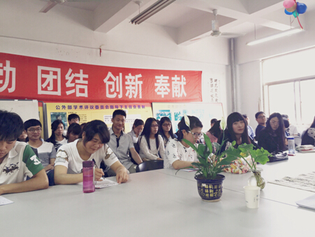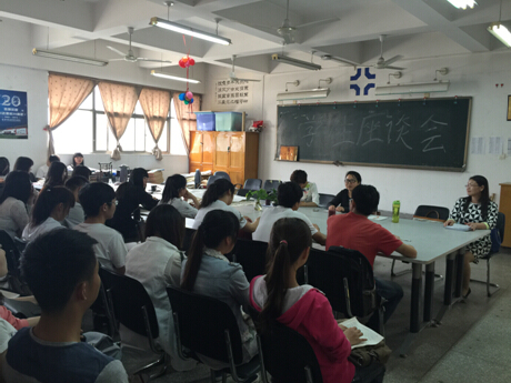 四月二十八日下午,2013级师生交流座谈会在公外部会议室举行。参加此次座谈会的员工均为2013级各班的学艺或者骨干代表,老师代表分别是公外部第二教研室主任王思燕老师,以及2013级教授综合英语的阮芳老师、张慧丽老师和教授听说课的屠瑞芳老师。此次座谈会在王思燕老师的主持下,就这学期员工在生活、思想以及学习,尤其是英语学习等方面和员工进行了交流座谈。