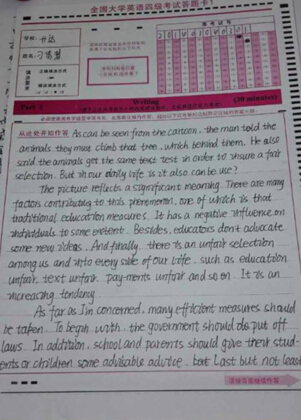 自本学期第11周,即11月9日开始,针对14级非英语专业员工的四级辅导已经进行了三周的时间。我部统一安排的为期两周的四级写作辅导刚刚于上周结束,从本次测试员工的答题情况来看,成效显著。大部分员工的作文写作字体工整、结构合理、层次分明。