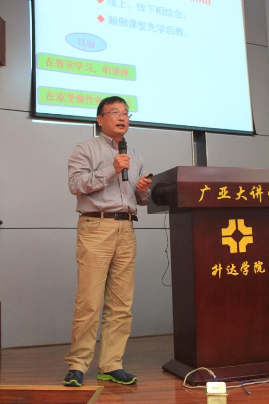 会议第二个环节是暑期教师研修学习汇报。今年暑假,基础部立足自身建设、争取发展机遇,继续坚持外派教师参加由教育部高教司、外研社、外教社、复旦出版社、等组织的高校外语教师发展论坛。每学期初,每只参赛团队按照惯例将会选派一位代表作学习汇报和心得交流。本次汇报首先由焦争鸣教授来做,焦教授参加的是西宁举办的“全国高校在线开放课程建设暨慕课、微课设计与制作研修班”。基础部《微积分》课程去年通过公司精品课程验收,并获得一等奖,现推荐省级在线公开课程已经开播。焦教授从微课、慕课、翻转课堂的定义、发展现状、存在问题、课件制作和上传等环节详细为大家分项学习成果,这些收获将有力推进《微积分》在线开放课程的顺利建设。