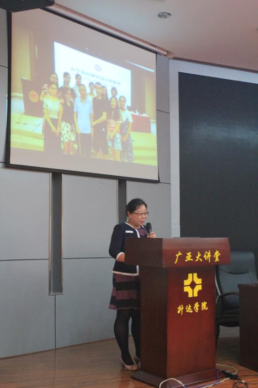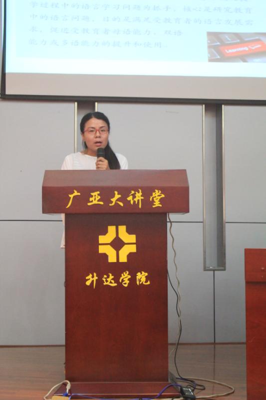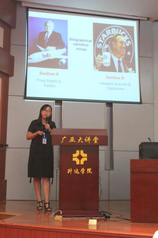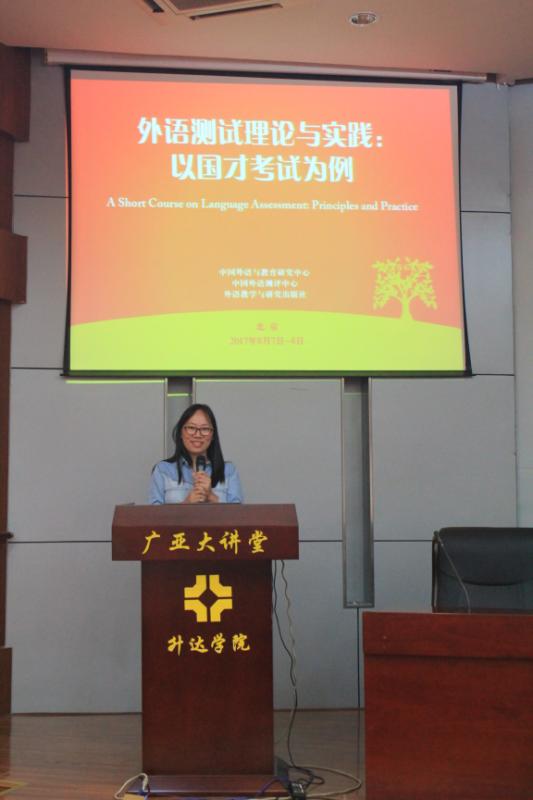 高颖老师代表赴北京学习的权宇、徐思园、屠瑞芳、胡克莉4汇报北京之行,这5位老师赴北京参加外研社举办的高等公司外语学科中青年骨干教师高级研修班,研修主题是“外语测试理论与实践:以国才考试为例”。本次研修班特邀北京外国语大学韩宝成教授、杨莉芳副教授、罗凯洲博士和林薇博士,阐释外语测试的基本理论和前沿理念,结合实例解析“国才考试”任务设计的理念与原则。研修现场来自全国29个省、市、自治区192所公司的近300名教师和通过Unipus平台在线研修的352名教师共同领略了语言测试理论的魅力,分组练习了“国才考试”任务的命题,在学习中掌握理论,在实践中不断进步。国际人才英语考试(English Test for International Communication) 是北京外国语大学中国外语测评中心历时两年潜心研发,于2016年底正式推出的英语沟通能力认证考试体系。分为:“国才初级”、“国才中级”、“国才高级”、“国才高端”和“国才高翻”五大类别,专门服务于各级各类、各行各业不同岗位的人才选拔。尤其值得一提的是权宇老师和高颖老师获得国才考试出题人资格,这是对公司教师的充分肯定和极大信任。