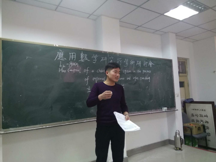 其次,有青年才俊李天瑞老师,作题为“(H无穷)Control of a Chaotic Finance System in the Presence of External Disturbance and Input Time-delay”(“一类带有外部干扰和输入时滞的金融混沌系统的H无穷控制”)论文阅读报告,主要报告了该篇论文研究的对象及用到的思路方法,同时也给出了自己的想法,想尝试把控制器及该系统进一步的改进。
