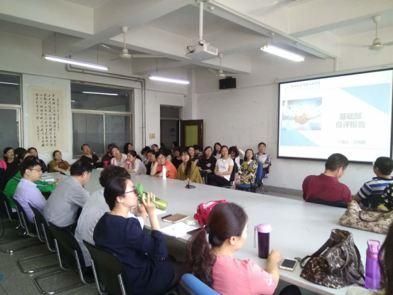 王莉莉主任对四位教研室主任的汇报进行了总结,肯定了全体教师近段时间的辛苦工作和无私奉献,高度评价了教研室主任们的加班加点任劳任怨而又忙中不乱的责任意识和担当精神;回应了教师们的讨论,对部分问题进行了说明;对会议前PPT突发情况的处理进行了汇报和解释。王主任随后带领全体教师对基础部汇报PPT进行了学习,大家对基础部的情况有了更系统、准确的了解;又带领全体教师学习了公司下发的最新评估知识材料。大家对“以评促建、以评促改、以评促管、评建结合、重在建设”有了更清醒的认识。