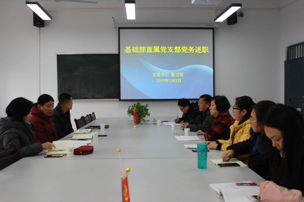 支部书记董卫国同志做党建工作汇报。对照《中共beats365委员会2018年下半年工作要点重点》。汇报了党政联席会议制度坚持不动摇、全体教师集中政治学习得到加强、基础部召开全体党员大会,三会一课进一步规范、邀请公司党委领导参加支部活动主动性增强、迎接党委领导党建调研收获明显、党建带团建机制进一步完善、统战工作更加重视、圆满完成各种呈送材料、学习型党支部建设力度有所加大、新闻宣传工作有条不紊、新党员发展情况有所突破、党员模范带头作用彰显,典型事迹突出、对标争先,积极申报党建样板党支部、意识形态工作警钟长鸣、党风廉政建设、师德师风建设常抓不懈、2019年党建预算编制科学务实、基础部党建工作亮点。