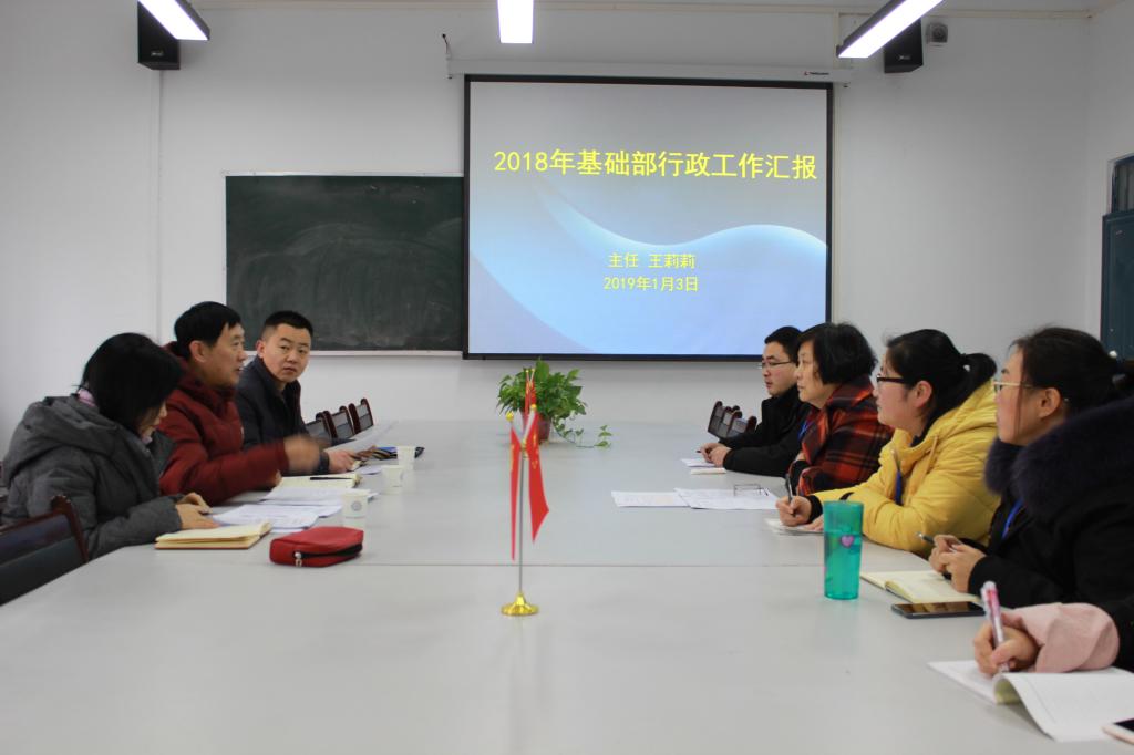 戎庭银书记传达了公司《关于开展本学期工作要点专项调研通知》和本次调研工作的工作流程,重申了此次调研工作的主要内容。主任和书记会前分别向各位调研领导呈递了行政工作汇报和党务工作汇报情况文字材料。王莉莉主任做行政工作汇报。王主任对照《beats3652018---2019学年第一学期工作要点任务分解表》,汇报了本学期工作要点完成情况,工作亮点,特色与创新情况及下学期工作建议。详细汇报了基础部开展的教育思想大讨论系列活动和成效、教研室工作得到省市肯定并分别获奖的情况、第五届中年教师讲课大赛、基础部导师制的显著成效、校企合作开展情况和目前面临的形势、基础部青年教师成长和发展情况等。王主任强调了基础部全体教师通过教育思想大讨论活动统一认识,汇聚了人心,对公司实现跨越式发展、理清思路、践行创办人办学思路充满信心。