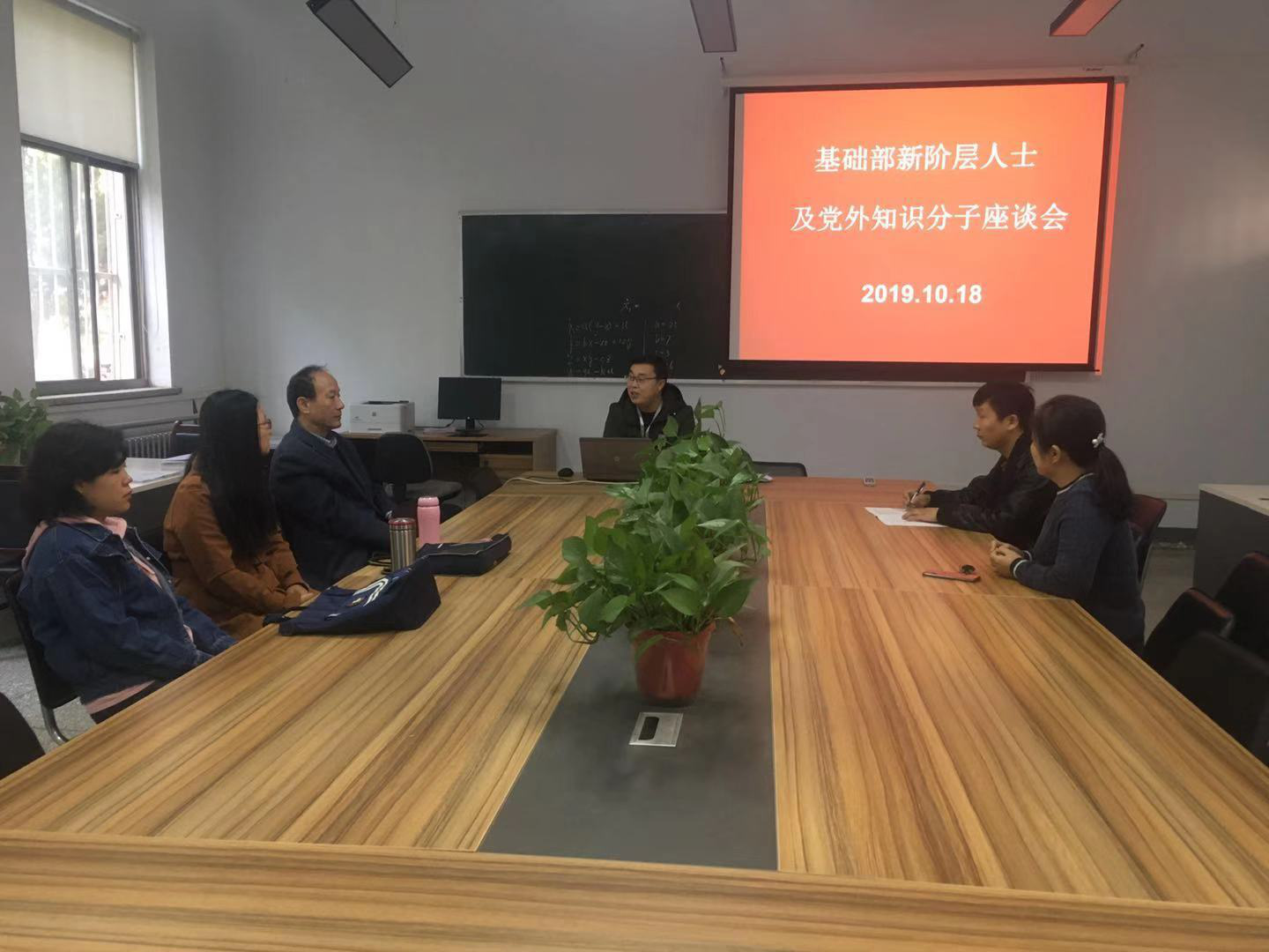 10月18日上午,基础部召开新的社会阶层人士及党外知识分子座谈会,邀请严广松教授、何俊副教授等几位新的社会阶层人士和民主党派知识分子参加座谈会,本次座谈会的目的是广泛听取各位老师对部门工作提出的建议和意见。