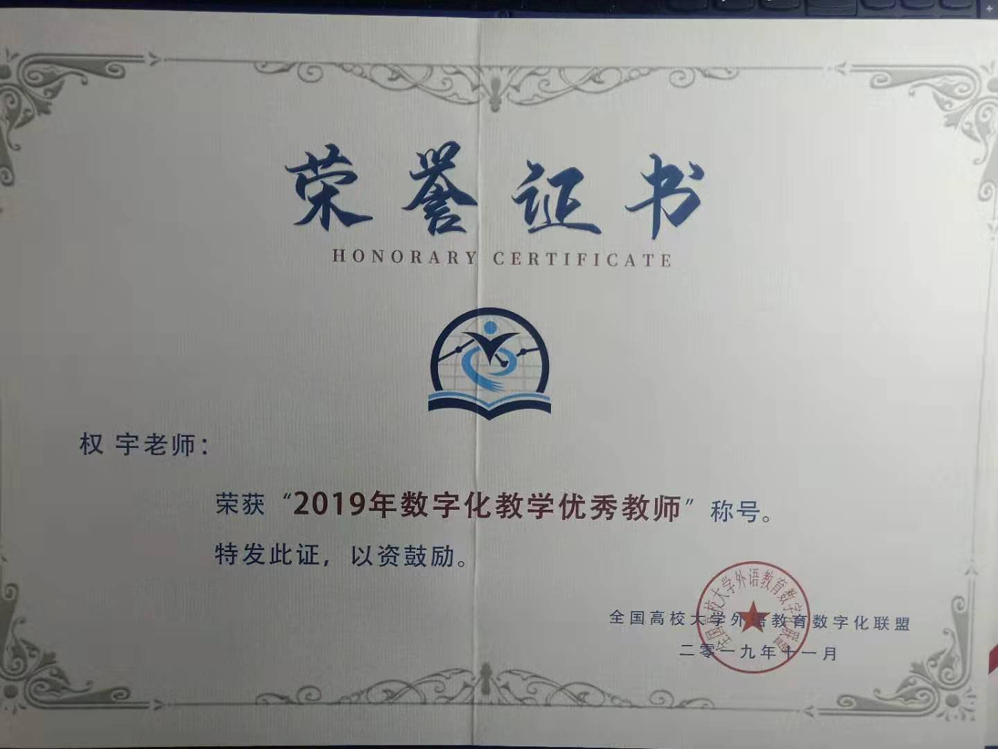 基础部申报的课题作为全国遴选出的五个重点课题,在此次大会上作了课题汇报。基础部权宇副教授代表公司发言,她从数字化教学基础、项目特色、外语教学应用场景、课题计划等方面,汇报了公司大学英语教学团队“数字化3.0视阈下基于‘产出导向法’的大学英语混合式课程建设”课题成果,获得与会专家与同行的一致好评和高度赞扬,荣获此次年会全国优秀课题。基础部大学英语教研室主任权宇副教授荣获“2019数字化教学优秀教师”称号。