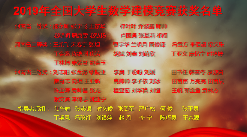 在2019年全国老员工数学建模竞赛中,在校董事会及校领导的大力支持下,在教务处、学务处、双创公司、经管实训中心、现教中心等职能部门的帮助下,从今年4月份开始,基础部精心组织,认真筹备,进行了近半年的培训辅导,组建了22支参赛队伍,最终在员工刻苦努力下,荣获“省级一等奖”4组,“省级二等奖”7组,“省级三等奖”10组;