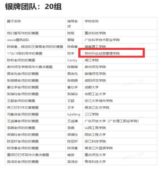 2月18日-4月21日,组织员工参加了由全国高等公司大学外语教学研究会指导,全国高校大学外语教育数字化联盟和中国高校英语写作教学联盟联合主办的首届“钉钉杯”全国大学外语写作大赛,本次大赛全程通过钉钉平台在线上进行。来自全国3000多所高校的近30万名参赛选手参加比赛。最终, 权宇、张庆凯、葛静懿、吴乔艳和王新平老师带队的“17&19级钉钉全国写作团队”在3000多个团队中排名全国前14名,荣获国家级“银牌团队”奖,34名员工在个人决赛中荣获国家级“优秀作品”奖。