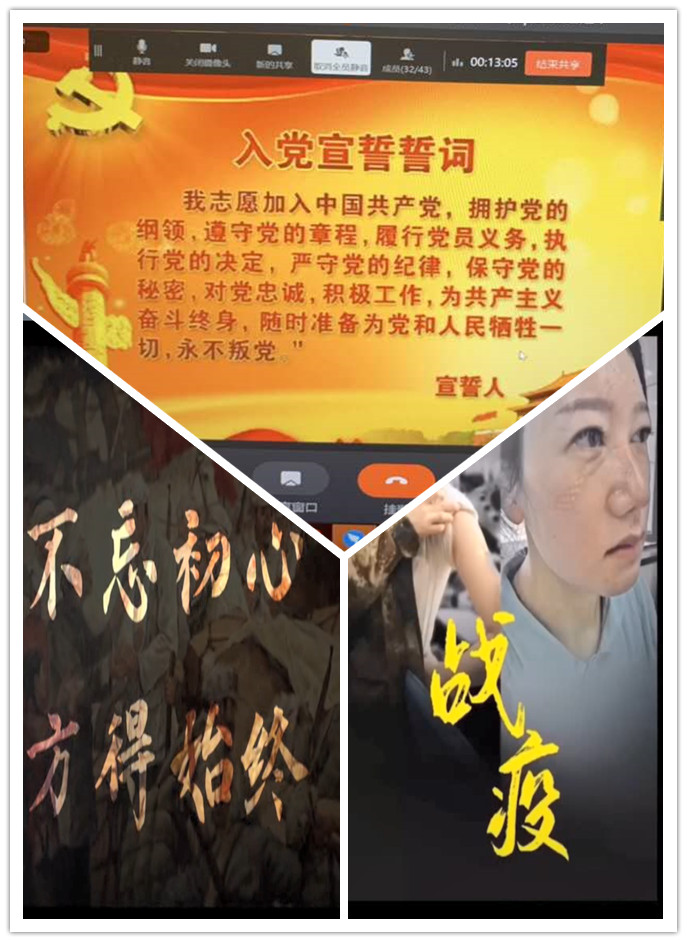 接着,通过屏幕共享形式,组织大家集体观看了《不忘初心》和《最美逆行者》两个视频,深入学习先进典型事迹。中国共产党人坚持革命、不畏艰险的英雄主义气概,为党和人民事业英勇献身的崇高精神和坚定信念,深深地打动着每一位党员。