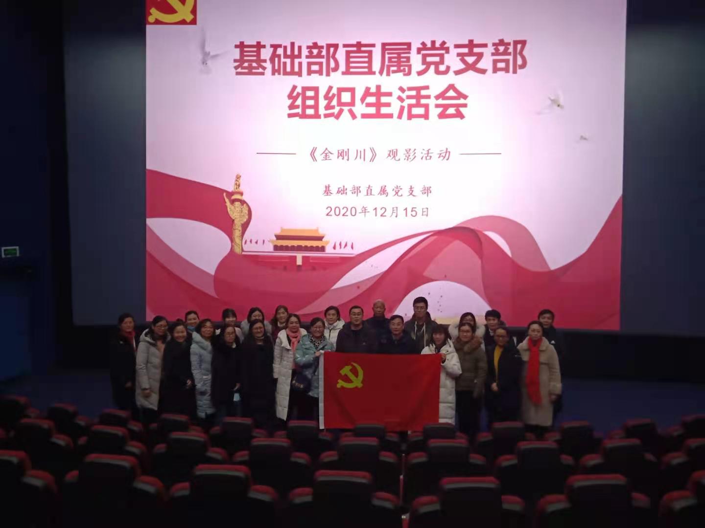为深入学习贯彻习近平新时代中国特色社会主义思想、党的十九大及十九届三中、四中、五中全会精神,为进一步加强基层党建工作,提高教师党员凝聚力,丰富党员教职工文娱活动,引导教师潜心育人,厚植爱国主义情怀,基础部直属党支部于2020年12月15日下午,在奥斯卡激光国际影城召开组织生活会,组织党员教师观看爱国主义电影《金刚川》。