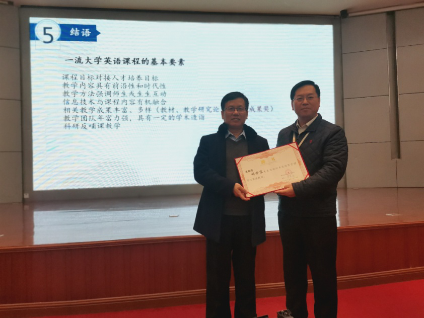 在报告中,胡开宝教授从自身对大学英语课程的思考出发,在梳理一流课程的定义基础之上,重点探讨了一流大学英语课程建设的理念和具体路径。胡教授指出,一流的课程应该是设计科学合理,教学组织与实施突出员工中心地位,课程管理与评价科学且可测量。在建设一流大学英语课程体系中,有三要素,即研究型教学,研究性学习和研究性团队。教师在课堂中提升学术含量,员工在学习中重视钻研性学习,教学团队应做到教学与科研相结合。在一流大学英语课程建设的实践部分,胡开宝教授给在座的各位老师展示了如何将大数据、AI技术应用到课堂中,以信息技术辅佐教学,提升教学效率和质量。