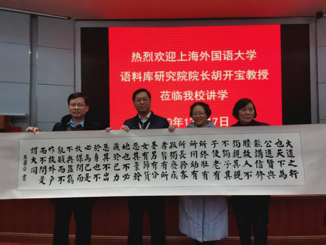 讲座结束后,公司张金安副董事长向胡开宝教授颁发客座教授聘书并赠予创办人王广亚博士的大同篇书法作品。