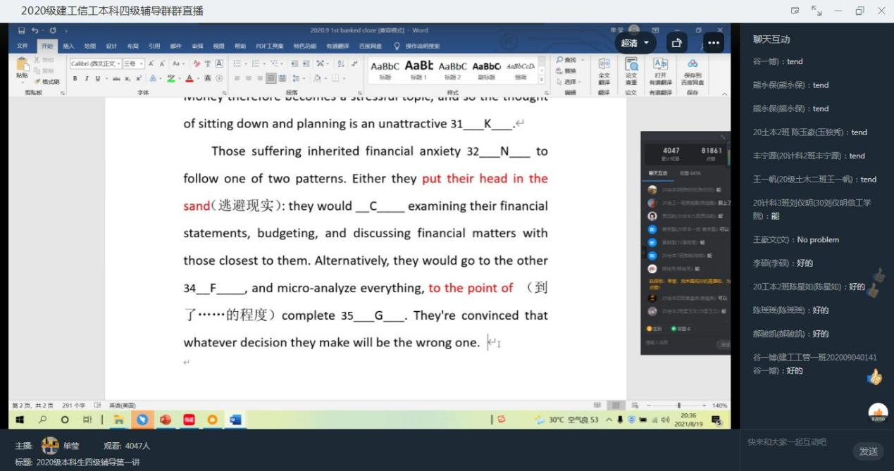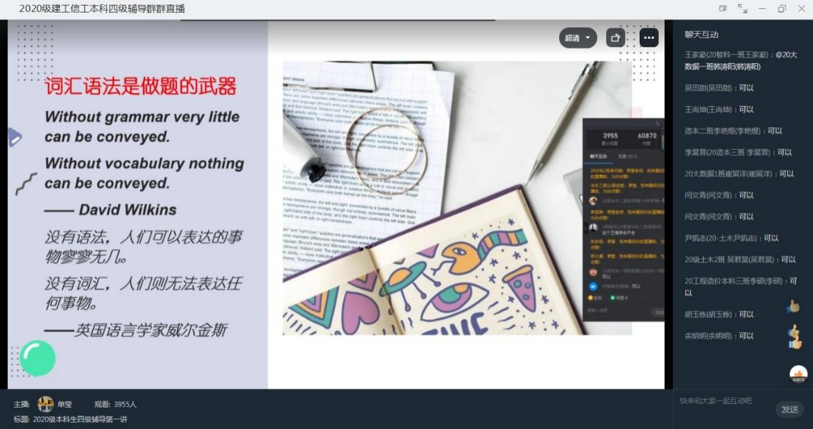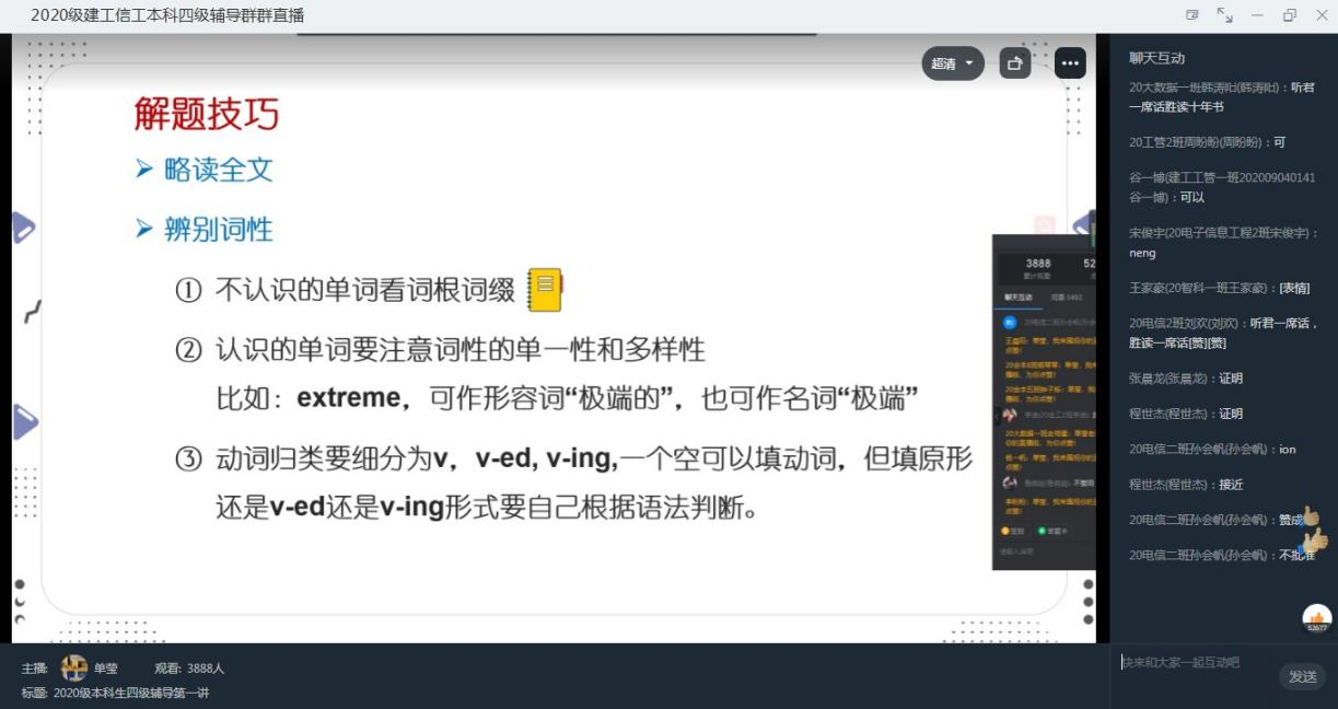 在此次讲座中,单莹老师从“选词填空”的题型特点、做题步骤、解题技巧等几个方面进行了细致入微的讲解,并结合四级真题和同学们一起将理论应用于实践。讲座生动有趣,同学们热情高涨,师生互动性强。据统计,最终共有4020名20级员工参加了此次讲座,直播中发消息数高达3577条。