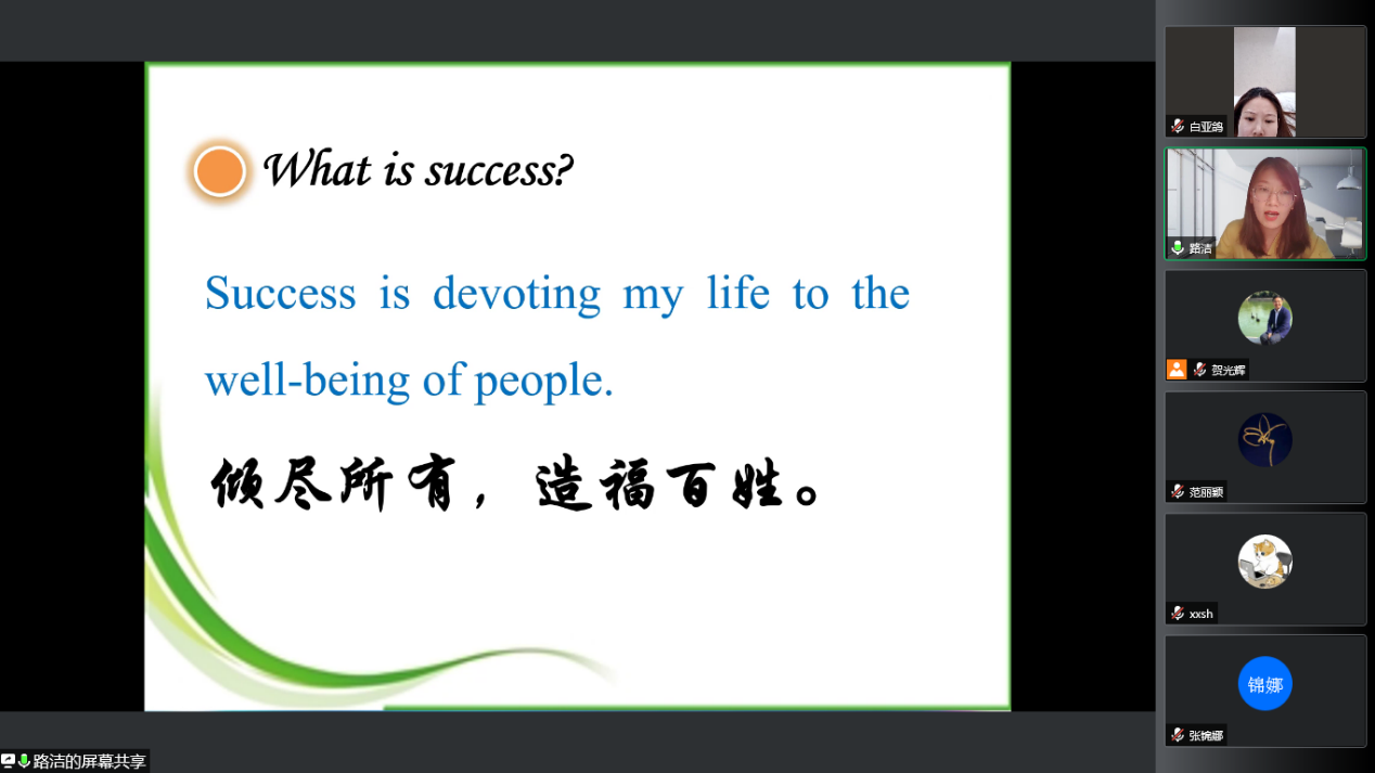 接着,路洁老师就《综合英语Ⅲ》第一单元进行了教学展示,以“What is success?”这一话题作为切入点,结合屠呦呦的励志故事诠释了“倾尽所有,造福百姓”的成功观,传递了勤奋坚持的钻研精神;之后分析了文章结构,结合丘吉尔的故事讲解了文章主旨:成功的秘诀是永不放弃。
