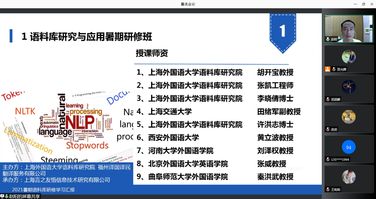 赵阳老师(7.12-7.18)赴上海参加了由上海外国语大学语料库研究院主办的语料库研究与应用暑期研修班。在研讨会上分享了语料库应用的流程,并演示了创建语料库的部分环节。