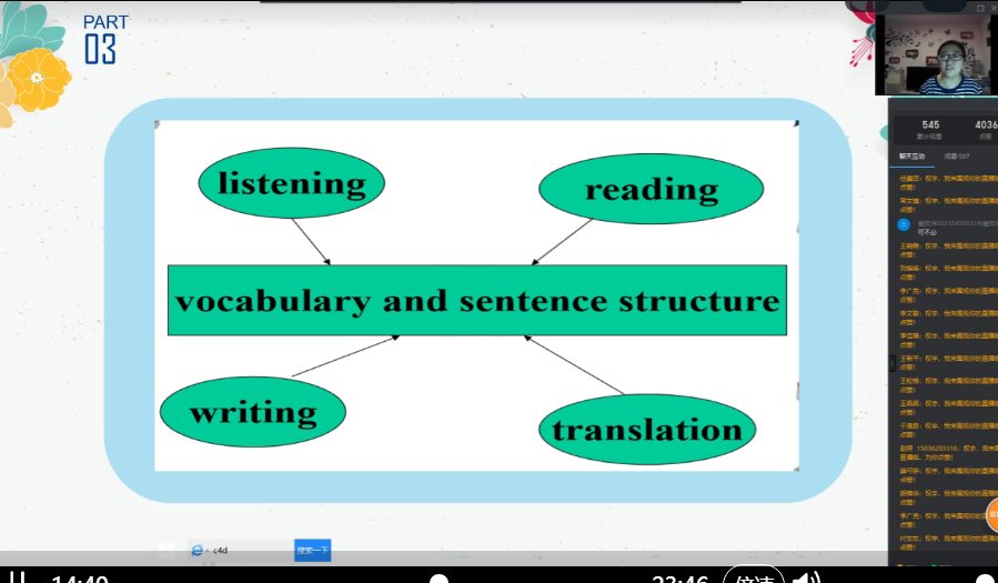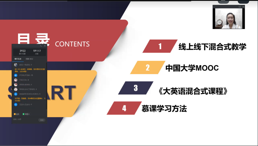 基础部遴选了权宇副教授、吴娟娟副教授、张庆凯副教授、王新平副教授、范楠楠副教授等五位骨干教师,分公司同时就大学英语学习的特点、大学英语四六级、大学英语学习的平台使用等方面对新生们进行指导和帮助。2021级共1万5千人次的员工相聚钉钉线上直播课堂,与老师们进行积极互动和交流,互动信息量达32000条。
