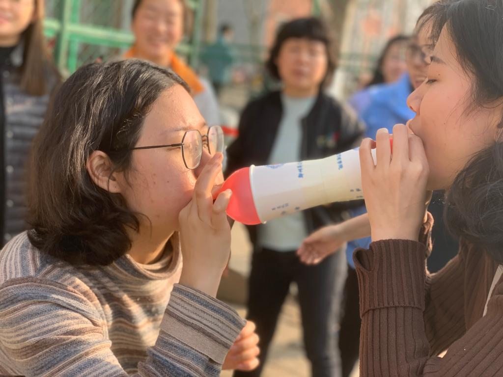 活动二:吹气球传纸杯接力比赛,7人一组,在比赛期间培养了团队的合作能力,增强了团队默契度,通过计时的方法决定获胜小组。