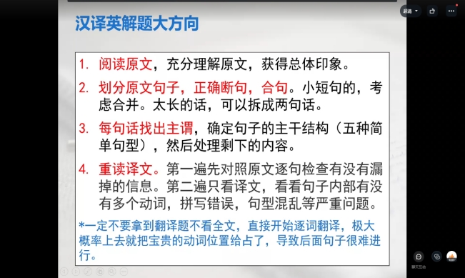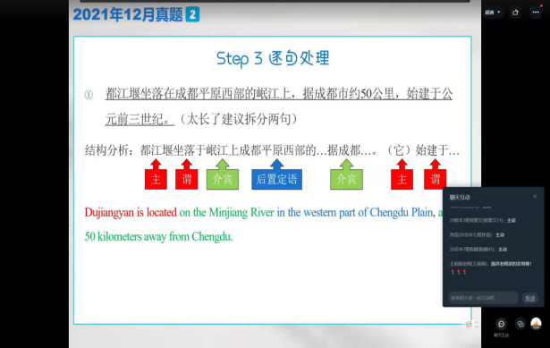 随后,张老师以2021年12月份大学英语四级考试3套真题里的汉英段落翻译为例,详细介绍了上述翻译技巧在实际解题中的应用。