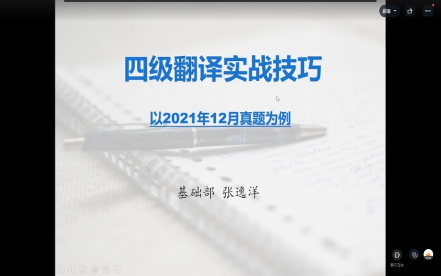 4月8日晚,基础部大学英语第二教研室张逸洋老师通过钉钉联播的方式,为即将参加2022年6月份大学英语四级考试的员工进行了一场题为“四级翻译实战技巧——以2021年12月真题为例”的讲座。讲座持续90分钟,基础部全体英语老师和1300多名同学在线聆听了讲座。