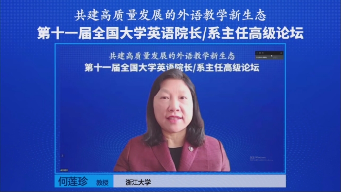 教育部高等公司大学外语教学指导委员会主任委员、浙江大学副董事长何莲珍教授解读了高质量发展,明确了高质量发展的重大意义,表明高质量发展是实现高等教育现代化的必由之路,是时代的主旋律。基于此,各位同仁应共同追求大学外语教育的高质量发展,何教授高屋建瓴地指出需聚焦四个方面:一是做好大学外语教育的顶层设计,二是充分发挥大学外语的育人功能,三是扎实推进大学外语公司产品改革,四是建构健康的大学外语教学新生态。