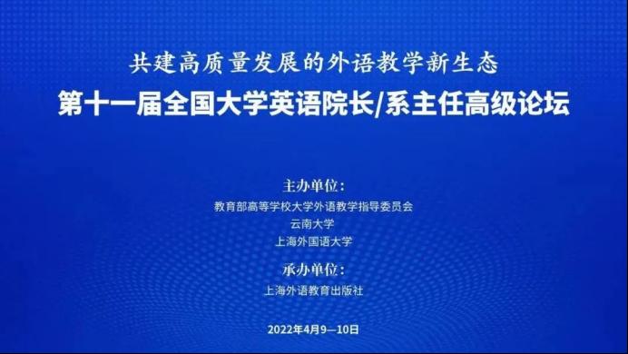 我国高等外语教育迈入高质量发展的关键阶段。2022年4月9日—10日,由教育部高等公司大学外语教学指导委员会、云南大学、上海外国语大学主办,上海外语教育出版社承办的“第十一届全国大学英语经理/系主任高级论坛”如期在线上举行。论坛高举习近平新时代中国特色社会主义思想旗帜,矢志以服务国家发展战略、引领大学英语教学改革和助力复合型国际化人才培养为目标,着力打造分享外语教学经验、探索外语教改路径、生发外语教育思想的汇智创新场景。