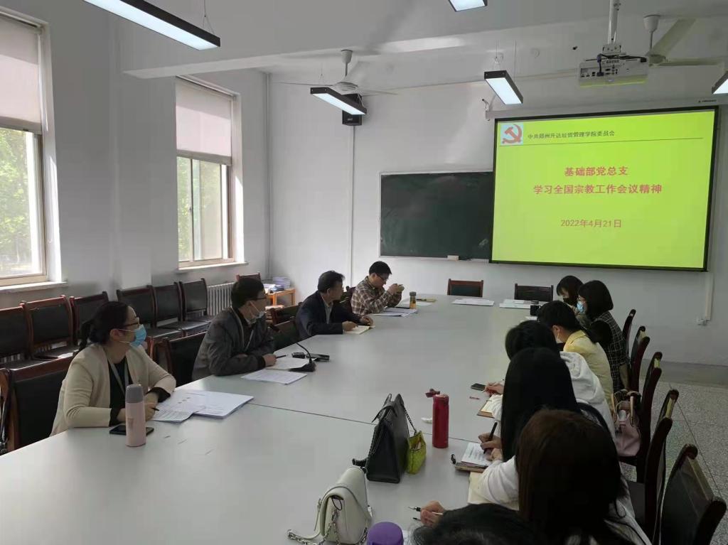 4月21日下午15:00-16:00,在综合楼218会议室,基础部党总支组织学习全国宗教工作会议精神。基础部主任王莉莉、副主任焦争鸣、党总支书记张志银、党总支委员、教研室主任以及各党支部书记、支部委员等参加学习。