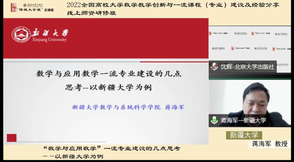 新疆大学党委常委、副董事长,蒋海军教授以新疆大学为例作了《“数学与应用数学”一流专业建设的几点思考》的报告。首先简单介绍了一流专业申报的流程,其次讲了新疆大学一流专业建设的思考,从意义,思路、实践三个方面做了分享。