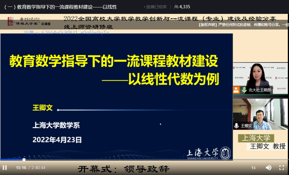 中国科学技术大学基础数学博士、上海大学二级教授、博士生导师、伟长学者、上海领军人才王卿文教授作了《教育数学指导下的一流课程教材建设——以线性代数为例》的报告,提出“教育数学”的概念,教育数学使数学变得容易。他把学习数学比作吃核桃,数学教育是研究破壳的问题,而教育数学是改良核桃的品种,是数学的壳变得容易破。他结合自己编写的线性代数教材的特色,全面介绍了线性代数课程的教学观。