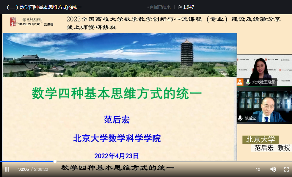 按照公司“能力作风建设活动”部署,紧紧围绕贯彻落实省委“十大战略”、能力大提升和作风大转变,切实把能力作风建设年活动和创新课堂教学、提升教学质量专项行动落实落细,4月23日-24日,基础部数学教研室组织全体教师参加2022全国高校大学数学教学创新与一流课程建设线上团队研修班系列讲座。