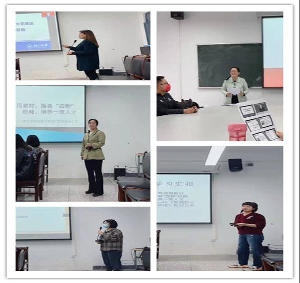 接着,阮芳、王新平、葛静懿和杨丹等四位骨干教师进行了教学讲座心得汇报。阮芳老师分享了聆听浙江大学何莲珍教授《服务国家人才战略的大学英语教学改革和教师发展》讲座的心得体会,强调了智慧化公共服务平台的重要性,同时要加强虚拟教研室建设,以价值塑造为引领加强课程育人,提升数字化能力。王新平老师与大家分享了“四新战略的理解”,强调为培养一流人才而进行的改革,把教材和课程改革做深做实。要着重培养员工的思辨、创新和应用能力。葛静懿老师分析了教材使用过程中常见的一些问题,并从编写理念、主题选择、语言素材以及活动练习等方面进行了阐述。杨丹老师分享了聆听了“外语教师国际期刊论文发表”系列讲座的心得体会,从五个写作步骤入手,逐一进行分析。同时,强调了提纲的重要性,并分享了常见的拒稿理由和修改策略。