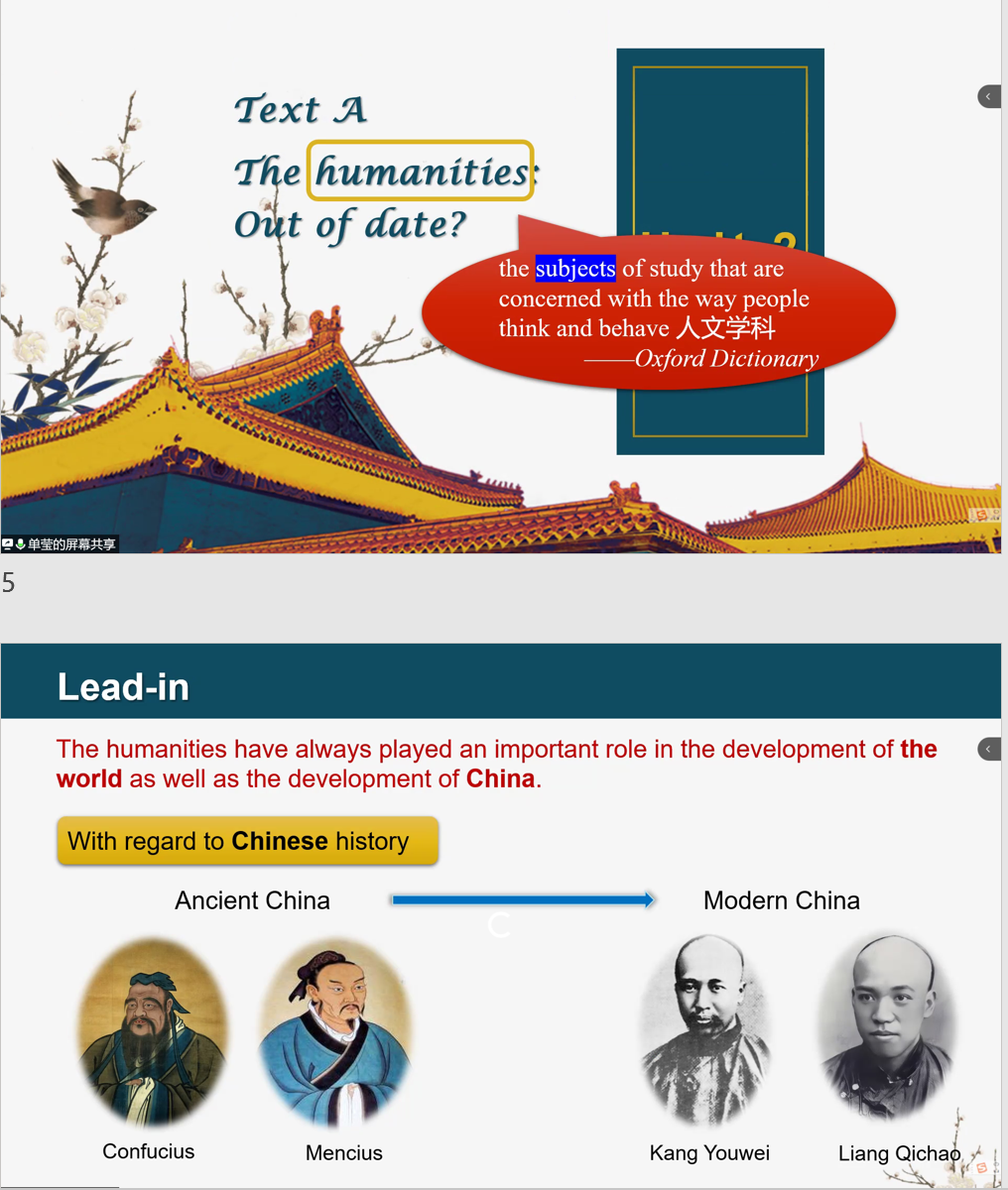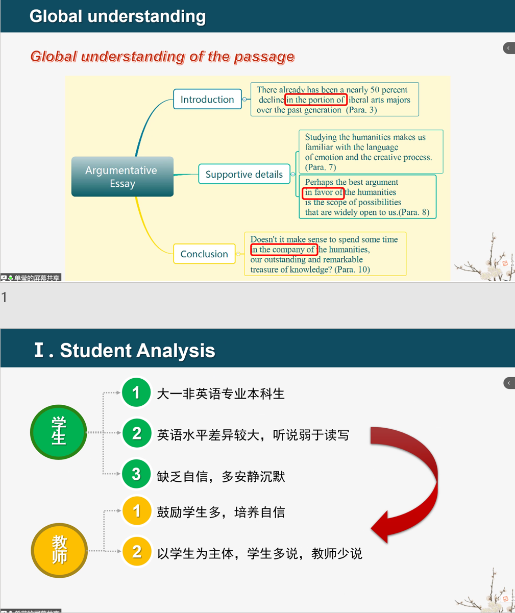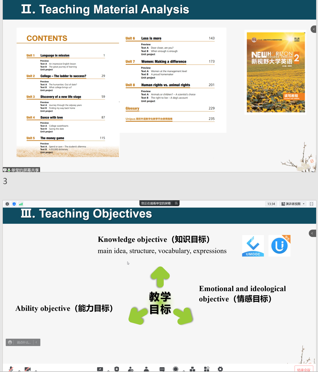 5月26日下午14:30分,基础部英语第二教研室的全体老师以腾讯会议的形式进行了在线教学观摩活动,基础部主任王莉莉教授也参与其中指导工作。首先,贺光辉老师简单介绍了本次会议的主题,对各位老师的积极参与表示感谢。随后,即将参加公司2022课堂教学创新大赛和第十三届全国高校外语教学大赛河南省赛区比赛的单莹老师进行了教学展示。