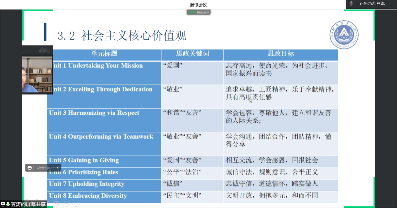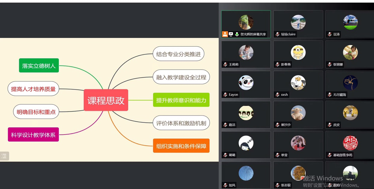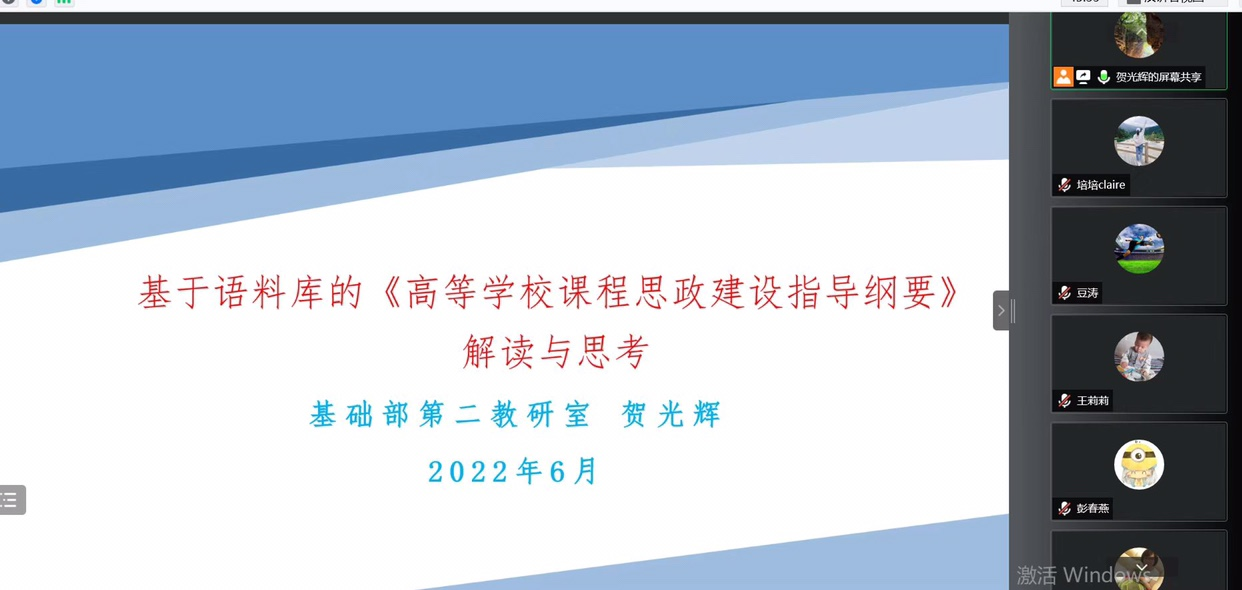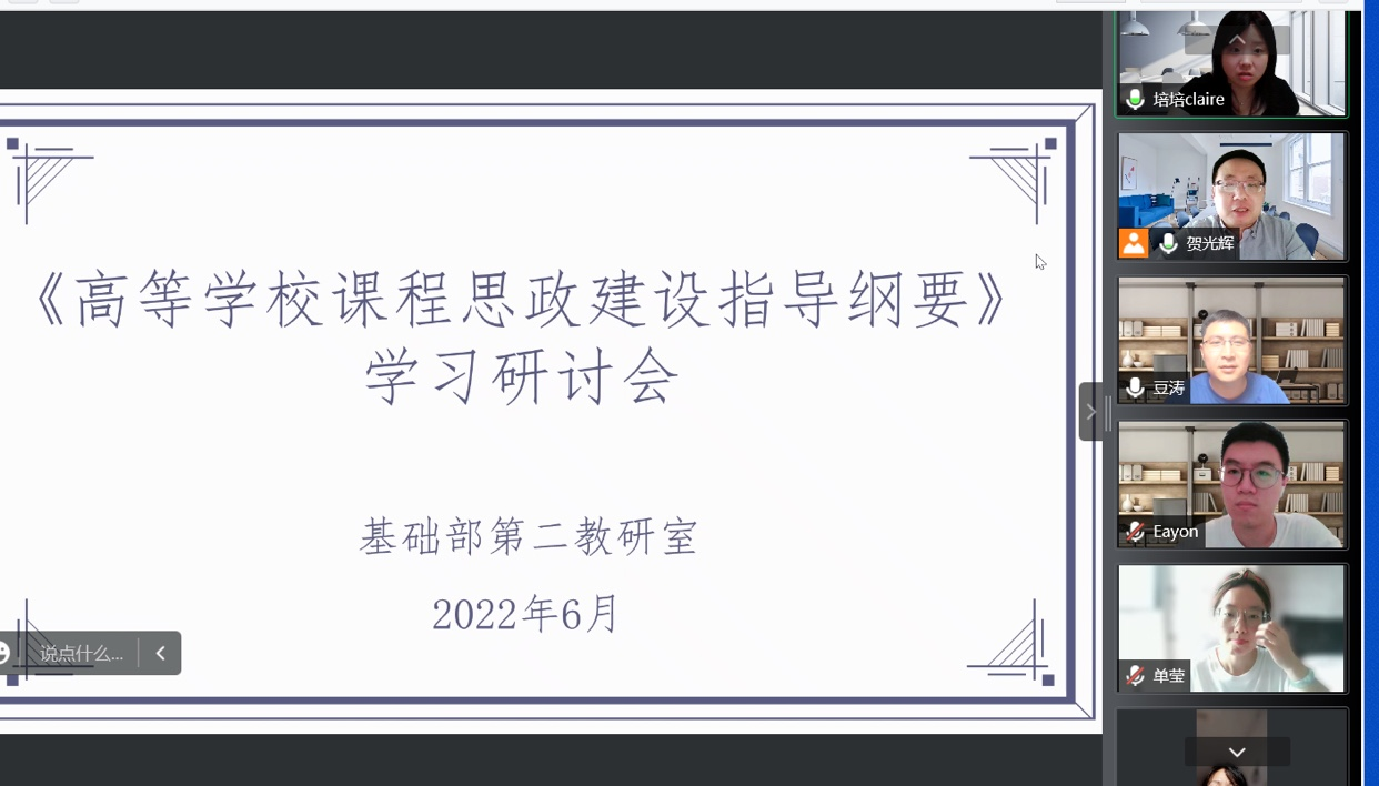 2022年6月27日下午14:30至17:00,基础部第二教研室开展了《高等公司课程思政建设指导纲要》线上学习研讨会活动,参会人员有基础部主任王莉莉教授、副主任焦争鸣教授、党总支书记张志银副教授、第二教研室全体教师及北京外国语大学豆涛博士。