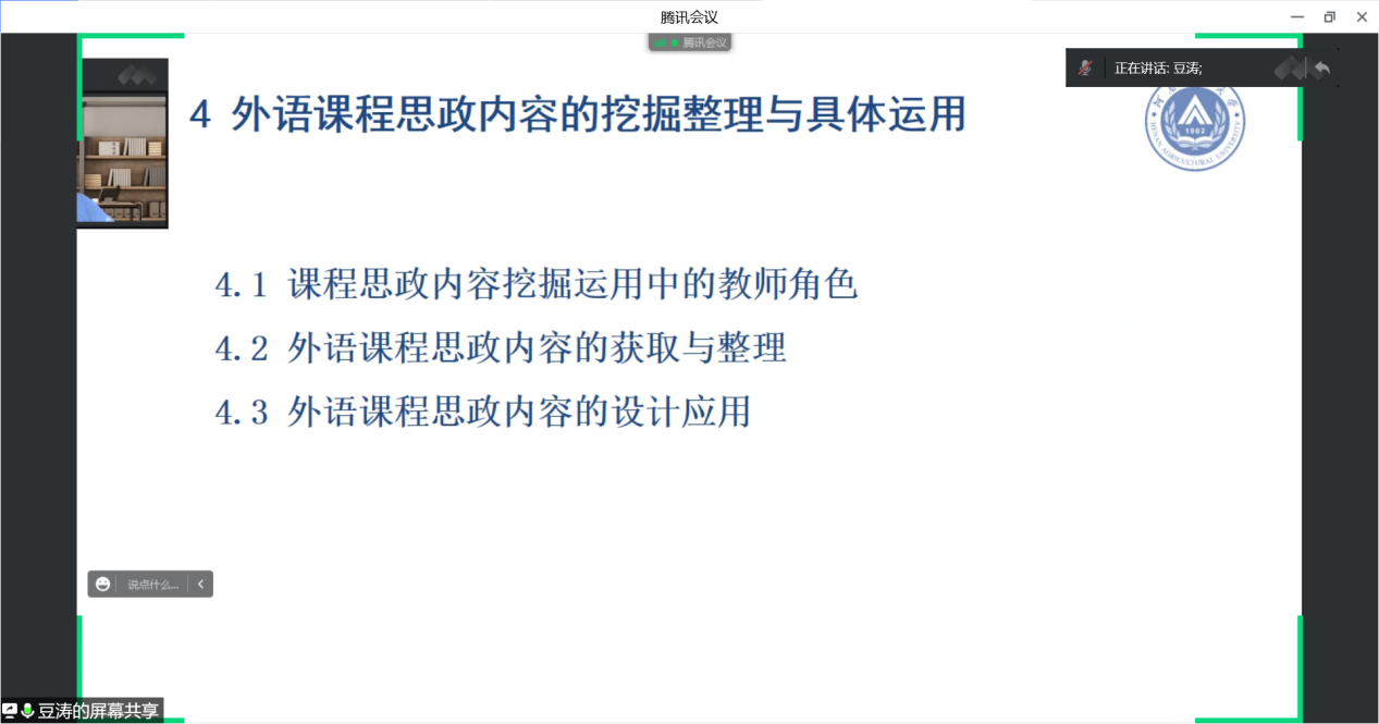 会议由第二教研室主任、党支部书记贺光辉副教授主持,首先由焦争鸣教授致开幕词,然后由北京外国语大学的豆涛博士为全体教师带来了一场精彩的讲座——“高校外语课程思政元素挖掘及运用”。虽仅有20分钟时间,豆涛博士的讲座却向大家系统阐释了高校外语课程思政的内涵、背景、意义、设计与运用,并强调了教师在课程思政设计中的角色与作用,也为教师获取课程思政素材方面提供了切实可行的建议。