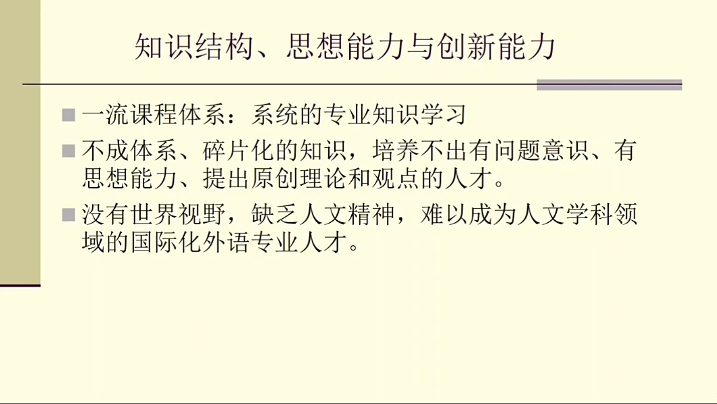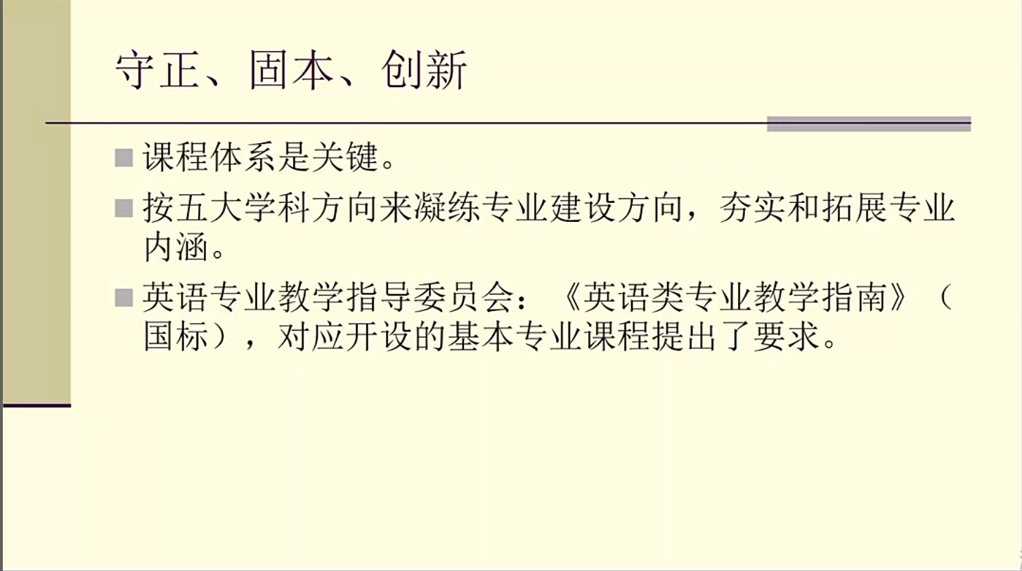 上海外国语大学查明建教授从2017年国务院公布的外语学科的五大研究方向出发,对比了以前清华大学和西南联大等公司培养出来的优秀的外语人才,指出现今的外语教学要把“守正、固本和创新”结合起来。针对现今英语教育中的问题,查教授指出了“不成体系、碎片化的知识,培养不出有问题意识、有思想能力、提出原创理论和观点的人;没有世界视野,缺乏人文精神,难以成为人文学科领域的国际化外语专业人才”,强调了中文素养是外语人的文化底蕴积淀和心智发展的基础,员工首先要具备良好的中国语言文化修养和文化自觉意识,才能更好地发挥专业特长。由此,查教授建议我们的英语教学要进行研究性教学,强调人文性和思想品质,从知识传授转向思想能力的培养,要有问题意识,以问题促进员工自主性学习和大量阅读,培养具有思想能力的人。