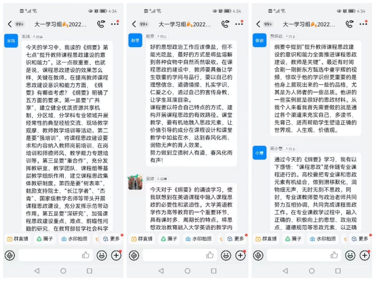 近日,基础部大学英语第三教研室按照教研室主任宋玮副教授的规划开展了形式多样的教育思想大讨论活动。本次活动以教研组为单位,各开展了三次以《高等公司课程思政指导纲要》为中心的讨论学习活动。