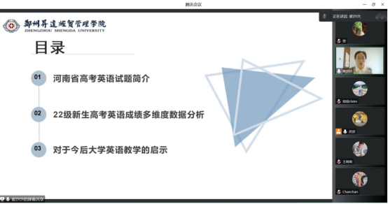 首先,崔沙沙副教授就“基于数据的22级新生高考英语成绩多维度分析与研究 ”这一主题进行了详细的数据分析和讲解。分别从河南省高考试题,22级新生高考英语成绩多维度数据分析以及对于今后大学英语教学的启示三个方面进行了深度研究和分析。