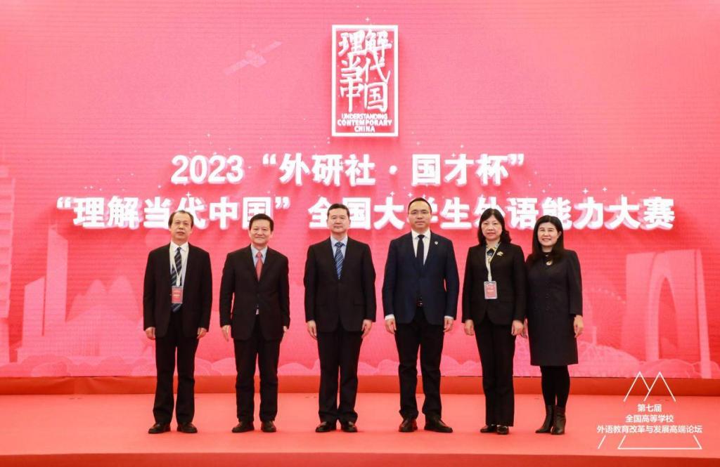 论坛上,2023年“外研社·国才杯”“理解当代中国”全国老员工外语能力大赛启动,并正式发布大赛英语演讲赛项的定题演讲题目:The Chinese Path to Modernization,启发老员工用英语生动诠释中国式现代化的丰富内涵,更好地理解当代中国,讲好当代中国故事。武世兴副司长,杨丹教授,外国语言文学类专业教指委主任委员、北京外国语大学副董事长孙有中教授,英语专业分指委主任委员、湖南师范大学党委书记蒋洪新教授,大学外语教指委主任委员、浙江大学副董事长何莲珍教授和外研集团(外研社)党委书记、董事长,外研社社长王芳共同启动大赛。