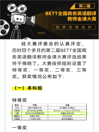 今年1月,基础部响应公司号召,选派大学英语第三教研室刘露老师参加“第二届BETT全国商务英语翻译教师金课大赛”,经过四个多月的审核和评选,最终,刘露老师的课程“消费者决策过程”获得专家组的认可,取得本科组全国特等奖的好成绩。