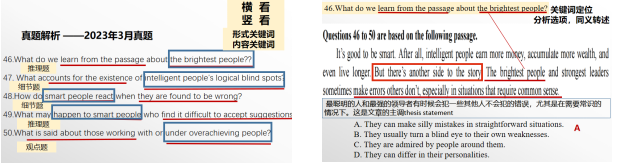 紧接着;第三部分首先详细讲解做题步骤,如何划出题干关键词并留心原文中的逻辑信号词,这些词汇都会快速地帮助我们找到正确答案。然后以2023年3月四级真题为例讲解如何运用以上技巧。