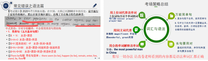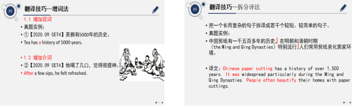 紧接着徐老师讲解汉译英考察重点,并总结2017年-2020年真题翻译话题的特征,分析四级翻译题目要求,并讲解的翻译标准即重视与通顺后给出四级翻译的细化原则;在第三部分徐老师总结翻译技巧部分着重以四级真题为例讲解增词法、减词法、词性转换法、无主句翻译、合并译法、拆分译法以及长难句的翻译技巧讲解。