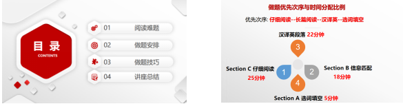 然后总结对长篇阅读所查考的五种题型进行技巧总结,然后讲解仔细阅读和选词填空的做题技巧,并以真题作为示例分析,并穿插了阅读理解中遇到的长难句的做题技巧。