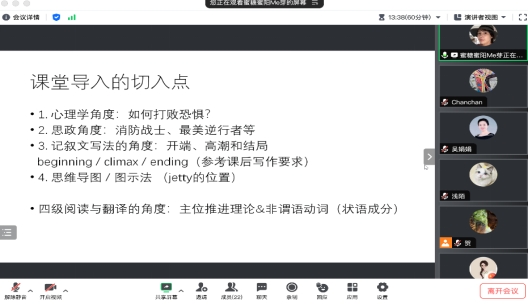 本次活动利用腾讯会议平台进行,主要由孙晓鸣老师为大家做了基于系统功能语法理论的“主位与述位”句法结构拆分理念与课堂教学相融合的教学理念的分享。孙老师所讨论的课程选材是《新视野大学英语第三册》第二单元《Swimming Through Fear》。其授课的主要思路是,首先对全文每一段落中所包含的主位成分进行解析与提取,而多数情况下“主位”成分是我们一些主题句或结尾句亦或是核心信息句子的主语或叙述主题,通过对“主位”的优先提取并对此类成分向员工加以有效的、先在的传达,可以让员工在通读全文之前能够做到对通篇课文的新信息有个重点的了解,就会使员工快速掌握文章作者“想说什么”、“如何展开叙述与论说”、“话题于何时转折变换”等重点信息,如此一来,便可使员工能够尽快地将“位置信息”迅速转化为“已知信息”,以此达到令员工快速融入课文语境,增加员工的学习趣味性与积极性,减少学习的障碍,降低阅读难度。