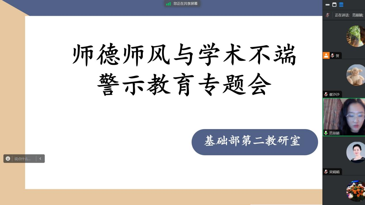 10月18日晚,基础部第二教研室利用腾讯会议平台召开了师德师风与学术不端警示教育专题会。会上,范丽颖老师带领大家学习了相关政策和文件,让大家再次明确了师德师风建设及遵守学术规范和道德的重要性。